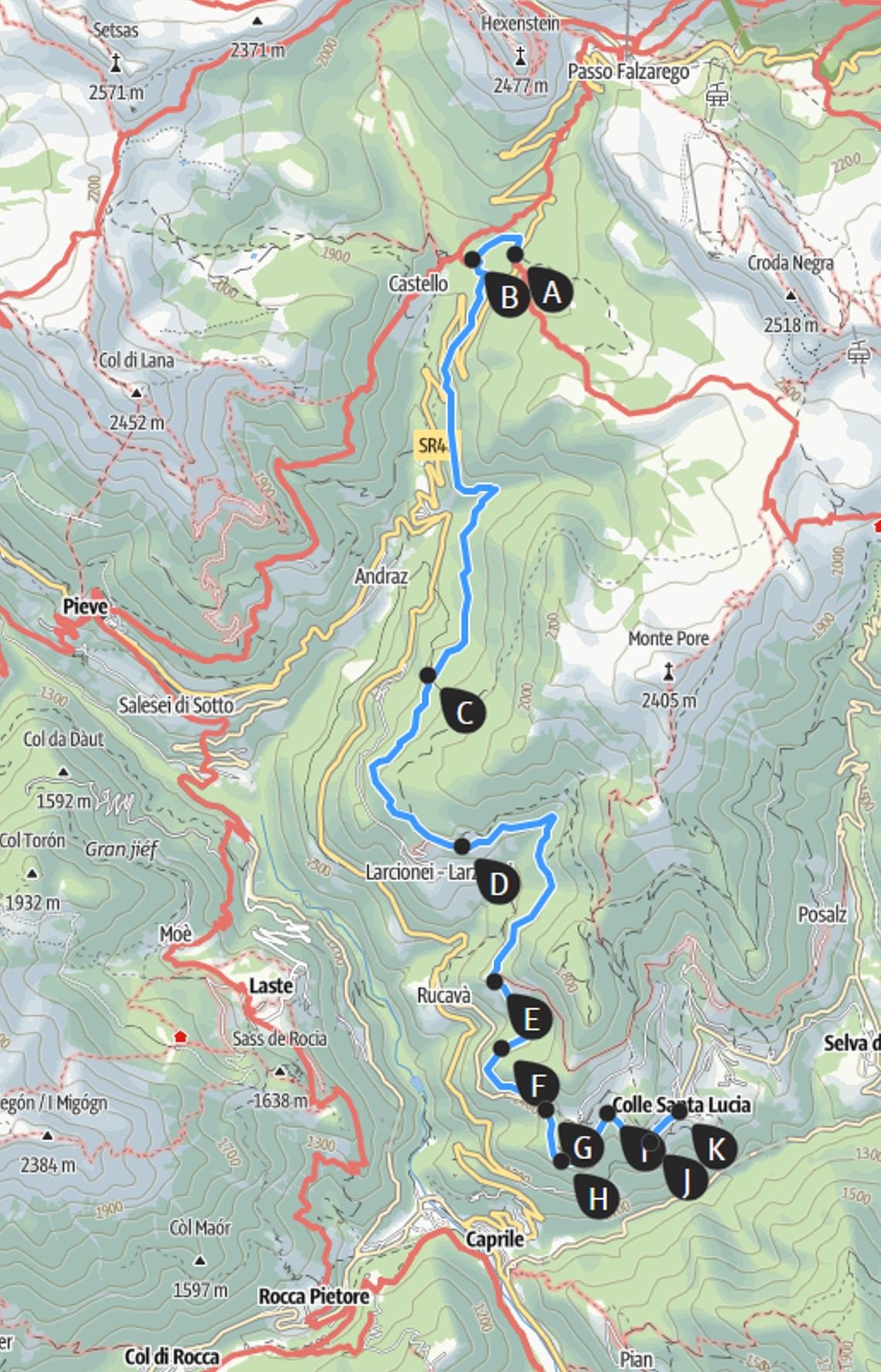 Unser Weg schlängelt sich größtenteils durch malerische Lärchen- und Fichtenwälder, jedoch stellt sich ein Abschnitt als besonders herausfordernd dar, da er aufgrund der großen Maschinen, die zum Beseitigen des Schadholzes eingesetzt wurden, stark verschlammt und schwer begehbar ist. Eine willkommene Erfrischungspause finden wir auf einem Bauernhof in Colcuc (Punkt E in der Karte Abb. 1), wo wir köstliches Eis aus Ziegenmilch probieren – ein wahrer Genuss! Der letzte Abschnitt der Wanderung ist etwas beschwerlich, da wir auf einer asphaltierten Straße weitergehen müssen. Doch die Freude ist dann umso größer, als wir das Ristorante Belvedere (Punkt H) erreichen, wo wir uns bei einem wohlverdienten Mittagessen erholen.