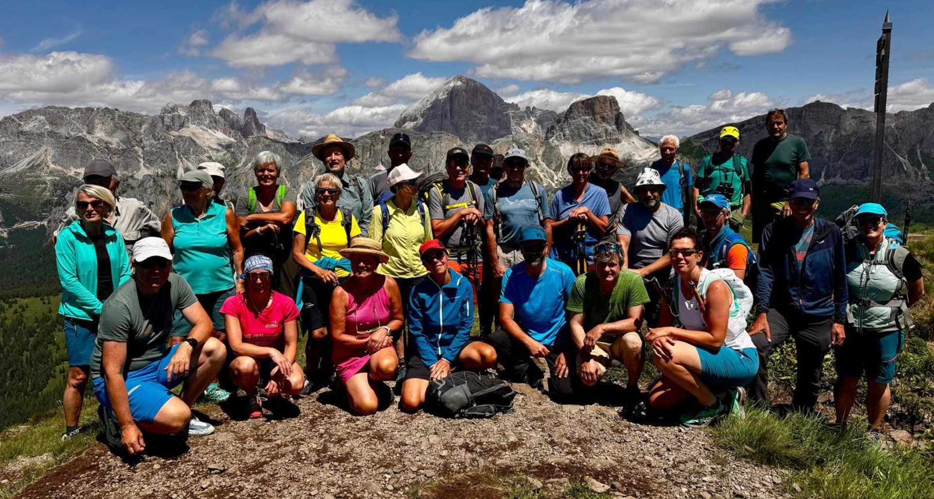 Die Gruppe A, wiederum in Begleitung von Alberto Colleselli, macht eine gemütliche Wanderung vom Passo Giau zur Malga Giau (in Abb. 5 im Viertel unten rechts – 6 km, 2 h, 300 m Abstieg). Der Startpunkt ist das kleine Kirchlein „San Giovanni Gualberto Vallombrosano“, welches dem Schutzpatron der Forstleute geweiht ist. Der erste Abschnitt führt uns in Richtung Forcella Giau, vorbei an prächtigen Almwiesen, die im vollen Blütenkleid erstrahlten. Die Vielfalt an Blumen und Kräutern bietet ein Farbenmeer, das das Herz eines jeden Naturfreundes höherschlagen lässt. Im gemütlichen Abstieg führt uns der Weg über sanfte Almwiesen, während wir den eindrucksvollen Blick auf die majestätischen Tofane, die Drei Zinnen, den Monte Cristallo und den Sorapis genießen können. Es herrscht kein Zeitdruck, was uns erlaubt, regelmäßig Rastpausen einzulegen. Bei diesen Pausen erfreuen wir uns an Wander- und Almliedern, der eine oder andere Witz wird erzählt, die Stimmung ist unbeschwert und fröhlich. Auf dem „Weg der Bergleute“ durch die Coste Gianope gelangen wir über Wiesen und schattige Waldpfade zur Malga Giau. Diese idyllische Alm gehört zur Gemeinde San Vito di Cadore und liegt nur 300 Meter von der Grenze zu Cortina entfernt. Nachdem wir die Malga Giau erreicht haben, warten wir auf das Eintreffen der Gruppe B. In dieser Zeit können wir den unvergleichlichen Ausblick von der Hütte aus genießen. Ob beim Watten oder beim Singen geselliger Lieder – bei entspannter Atmosphäre wurden viele schöne Erinnerungen geschaffen.
